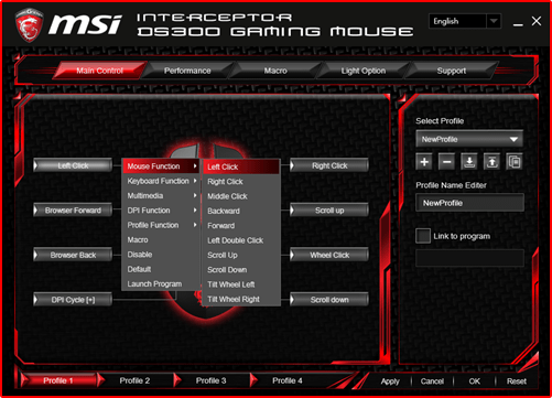Nutzen wir die Treiber für die DS300 können verschiedene Spielereien starten. Auf der Seite von MSI sind die Treiber ziemlich einfach zu finden. Aber man muss sich damit abfinden, dass als Sprachen nur Englisch und eine asiatische Sprache zur Auswahl stehen. Wer also unbedingt Deutsch haben will, wird enttäuscht. Auf der ersten Seite sehen wir die Maus im Überblick und ihre Tasten. Dort können diese auch ganz einfach umgestellt werden und wir können aus einem Dropdown-Menü auswählen, welche Funktion wir der Maustaste geben wollen. Um nicht jedes Mal die kompletten Settings ändern zu müssen, gibt es vier Profile. Diese sind frei konfigurierbar.
