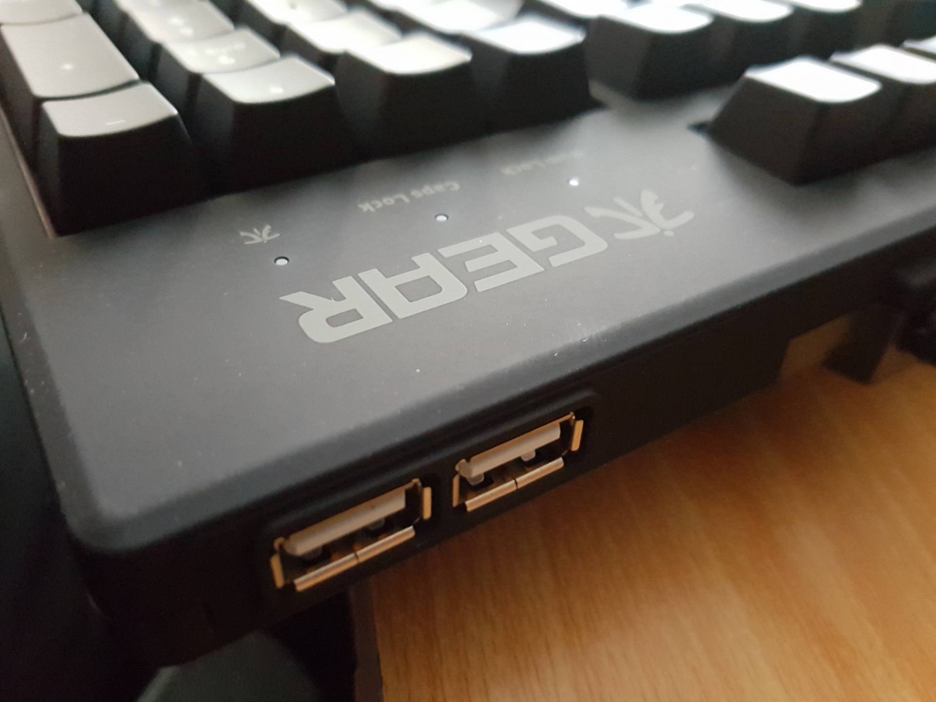 Die Verbindung zum Computer bekommt die Rush über ein knapp 1,8 m langes Kabel. Das Kabel ist von einer Ummantelung umschlossen und endet in einem USB Anschluss mit vergoldeten Kontakten. Zusätzlich befinden sich an der rechten, oberen Kante der Tastatur zwei USB 2.0 Anschlüsse. Auch im Lieferumfang enthalten ist eine, ebenfalls aus matten Kunststoff bestehende, Handballenauflage. Diese wird über zwei kleine Clips an der Unterseite mit der Tastatur verbunden. Zwar bietet sie der Hand eine ordentliche Auflagefläche, ist aber aufgrund der Materialwahl nicht die angenehmste seiner Art. Andere Hersteller bieten beispielsweise auch Auflagen aus Silikon an, welche natürlich vor allem nach längere Sessions wesentlich angenehmer sind.